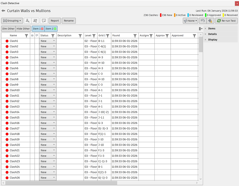 The Results window enables you to interactively review the identified clashes. It contains a list of all the clashes and several controls to manage them. For example, you can group clashes into folders and subfolders to simplify managing large numbers of related clashes.