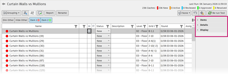 Click the Details drop-down list to show the Details panel, which displays a summary of the details from the Results table for the selected clash. This includes the clash name, the number of associated comments, the clash status, and information about the clash itself such as level, grid intersection, and clash point.