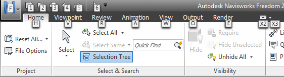 Navisworks provides accelerator keys, or keytips, to enable you to use the keyboard, rather than the mouse, to interact with the application window.