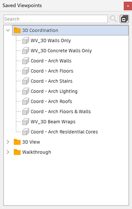 The Saved Viewpoints window is a dockable window that enables you to jump to preset viewpoints without having to navigate each time to reach an item.