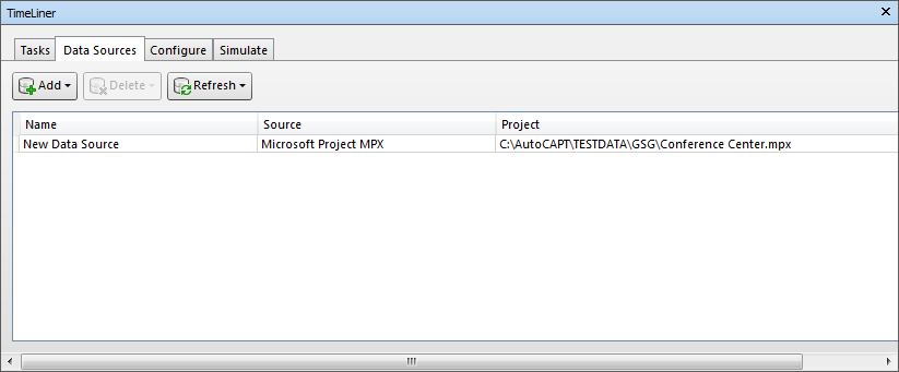 The Data Sources tab enables you to import tasks from a third-party scheduling software, such as Microsoft Project, Asta, and Primavera. It shows all added data sources, listed in a table format.