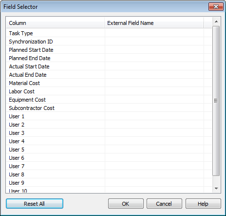 The Field Selector dialog box determines various options used when importing data from an external project schedule.