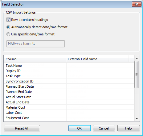 The Field Selector Dialog Box for importing data from an external scheduling software.