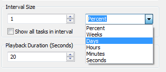 You can define the Interval Size to use when stepping through the simulation using the playback controls. The interval size can be set either as a percentage of the overall simulation duration or to an absolute number of days or weeks, and so on.