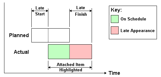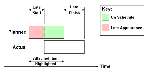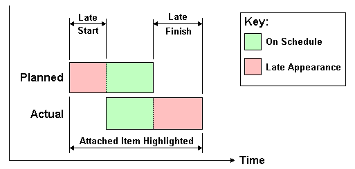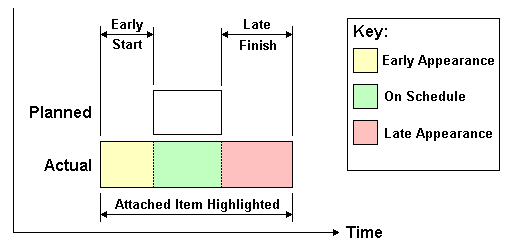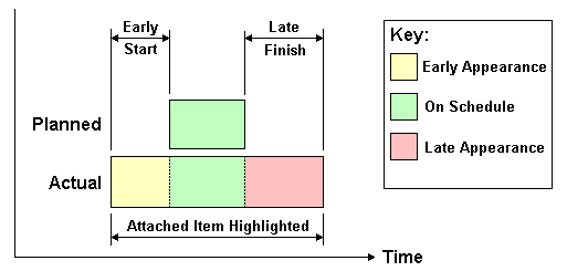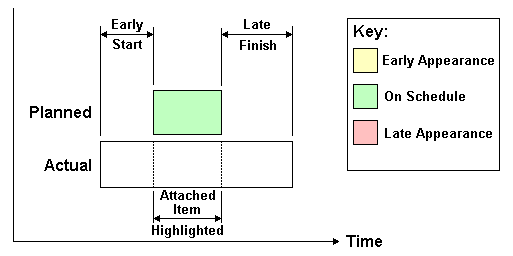 Planned (Actual Differences). Choose this view to simulate the Actual schedule against the Planned schedule. This view will only highlight the items attached to the task over the Planned date range (that is, between PlannedStart and Planned End. See diagram below for graphical representation). For time periods where the Actual dates are within the Planned dates (on schedule), the items attached to the task will be displayed in the Task TypeStart Appearance. For time periods where the Actual dates are early, or late in comparison to the Planned dates (there is a variance), then the items attached to the task will be displayed in the Task TypeEarly or Late Appearance, respectively.
