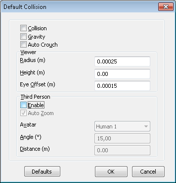 In the Default Collision dialog box, select the default options you want Navisworks to initialize with.