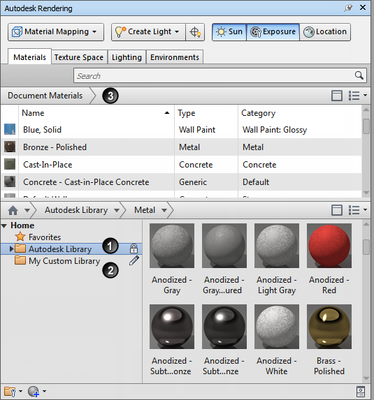 1 - Autodesk Library. Contains predefined materials for use by Autodesk applications that support materials. The libraries supplied by Autodesk are locked, as indicated by a lock icon. Although you cannot edit the Autodesk library, you can use these materials as a basis for customized materials that you can save in the user library.