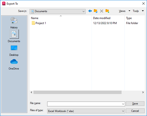 - In the Files of Type list, select a file format for the report: XLSX (the default) or CSV.