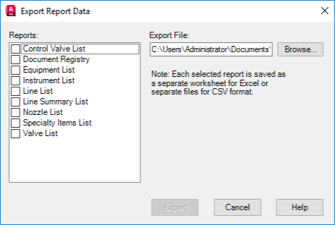 Note: The Export button only becomes active when you select one or more report types and have specified an export file.