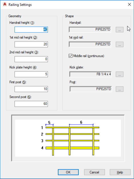 Sets the geometry settings for railings. Numerical values indicated in parentheses correspond to the labeled geometry in the preview image.