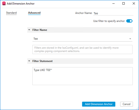 Allows filtering to specify anchor to select any existing filter as the dimension anchor or exclusion. Filters are stored in the IsoConfig.xml and can be used to identify more complex piping components selections.