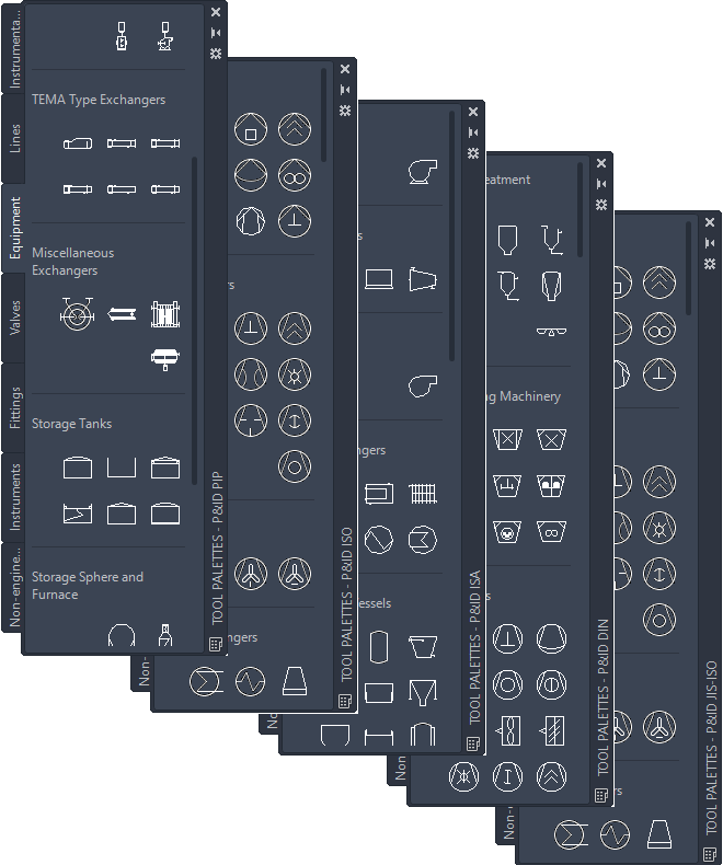 You can switch to another tool palette by right-clicking the tool palette title bar and selecting a tool palette. However, not all P&ID symbols that are available in one standard are the same in other standards.
