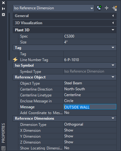 Places an Iso reference dimension into piping and displays the properties palette for the new Iso reference dimension.