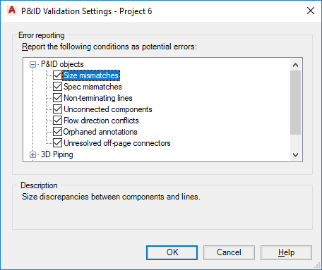 In the P&ID Validation Settings dialog box, in the Error Reporting tree, expand the P&ID objects and Base AutoCAD objects nodes. Select the check boxes for the error types to be flagged during project validation.