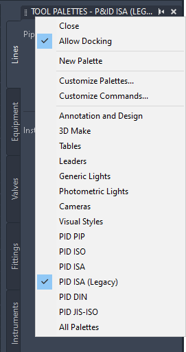 You can still work with legacy ISA symbols even if you choose not to update the ISA content. Select the P&ID ISA (Legacy) option from the Tool palette to continue using the legacy ISA symbols in your project.