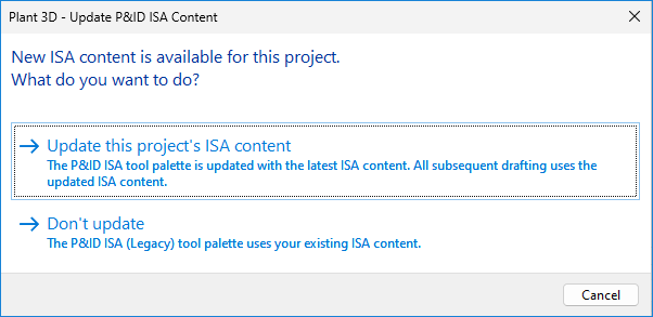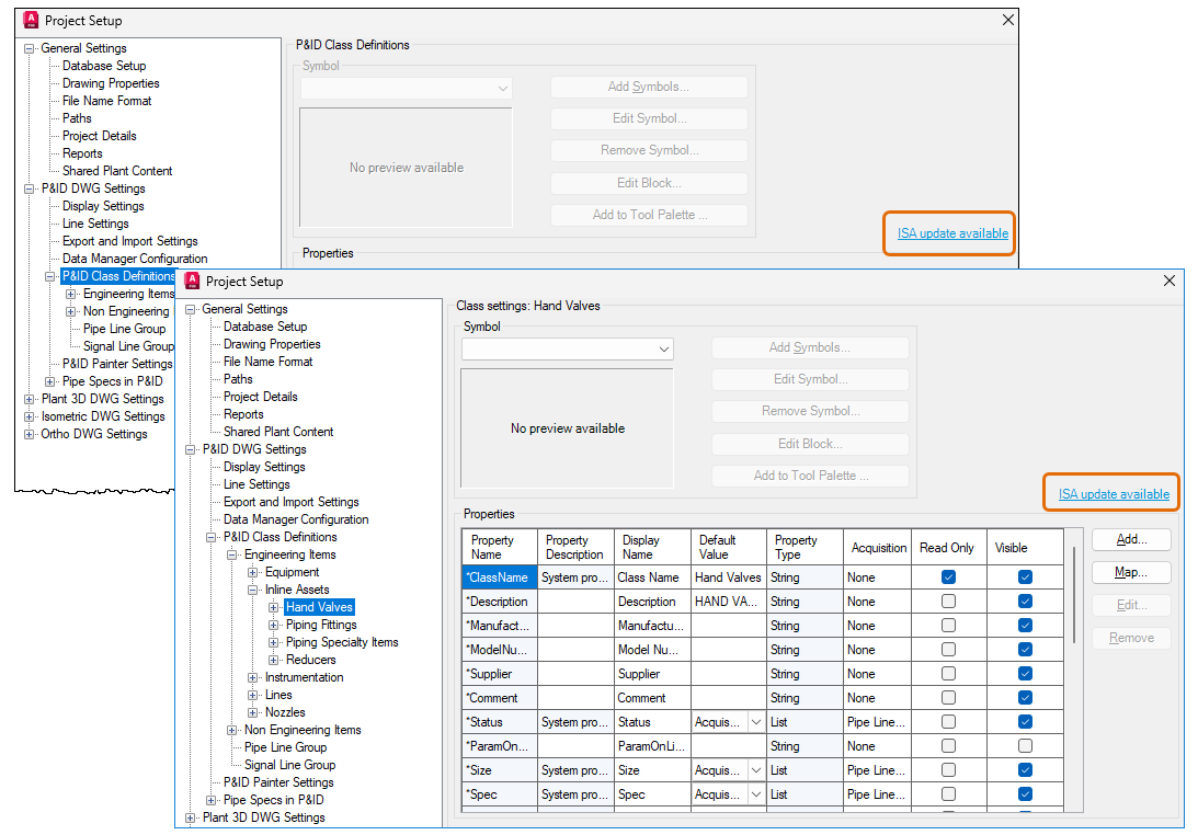 Additionally, a migration check has been implemented to validate legacy ISA projects when they are opened. When you open an ISA project that’s created in an earlier version, the "ISA update available" link is displayed on the P&ID Class Definitions node and on each of its child pages. Click the link to open the Plant 3D – Update P&ID ISA Content dialog box.