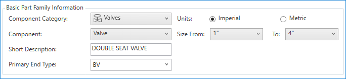 5. Under Basic Part Family Information, specify a size range (for example, 1” to 4”).