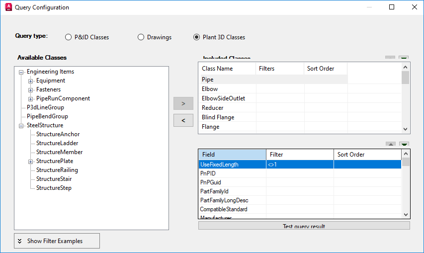 • For Query Type, click P&ID Classes, Drawings, or Plant 3D Classes.