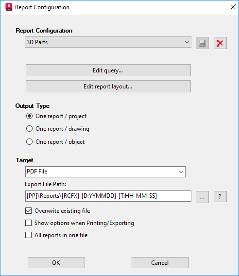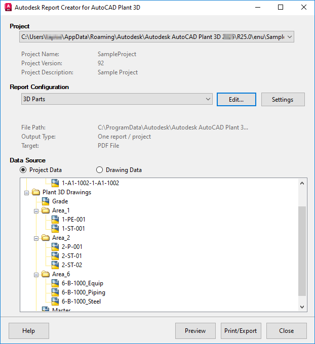 • Under Output Type, select whether you want Report / Project (all data is exported into a single report), Report / Drawing (data is exported for each drawing into individual reports), or Report / Object (each object has its own generated report, for example, an equipment specification sheet).