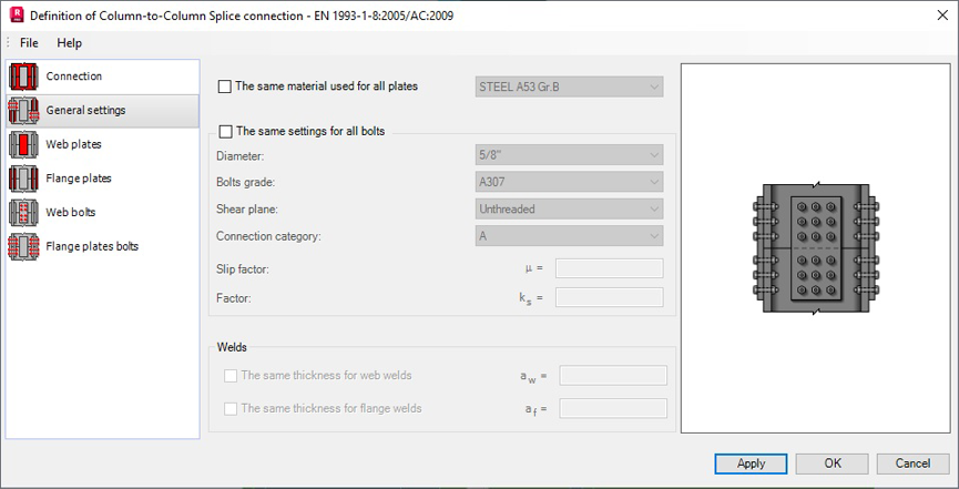 - For category B and C bolts, specify the slip factor and the Ks factor.