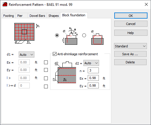 If the Block foundation option is selected in the Dimensions Definition dialog (Lean concrete/Block foundation tab), the Reinforcement Pattern dialog includes options used to determine parameters of the reinforcement connecting the foundation with the block foundation.