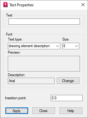 - Insertion point - in this field, specify the text location on the plotter drawing, either by typing coordinates or by selecting the point on the drawing.