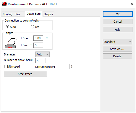 The Save As option allows you to reuse a set of reinforcement pattern parameters. This set is saved to your current user directory. You can reuse this set for the other element in the Reinforcement Pattern dialog or assign it to the selected element (or selected elements of the same type) in the RC Component Inspector.