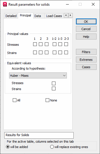 Select the Principal (solids) tab in the Columns dialog to select stresses or strains for presentation.