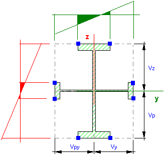 then stresses are calculated at characteristic points of the section, located in corners of the contour defined by the distances Vy, Vz. It may lead to overrated values of stresses at a point outside the section (blue points in the drawing).