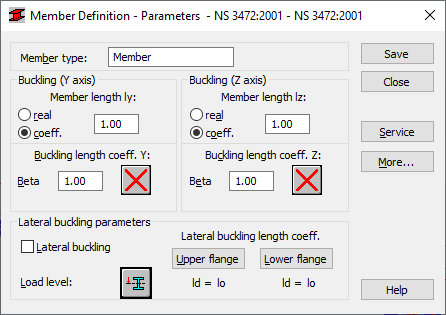 Pressing the More button opens an additional dialog box for definition of the remaining member type parameters provided in the code such as: equivalent moment coefficients, section parameters, etc.