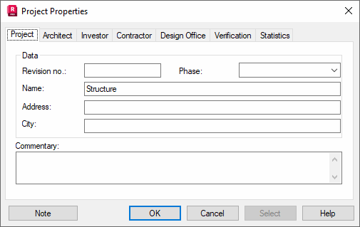 Click Note to open a calculation note (an *.rtf format file) with data concerning the structure and metadata regarding the architect, investor, and contractor.