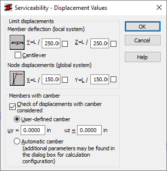 Use the dialog to define limit displacements (member deflections and node displacements) and to specify if the bar is a cantilever. You can define: