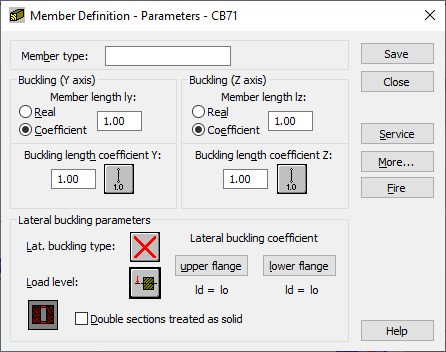 Lateral buckling type, load level, and lateral buckling length coefficients are used during the verification of lateral buckling of the member and may be selected in the Lateral Buckling Parameters field.