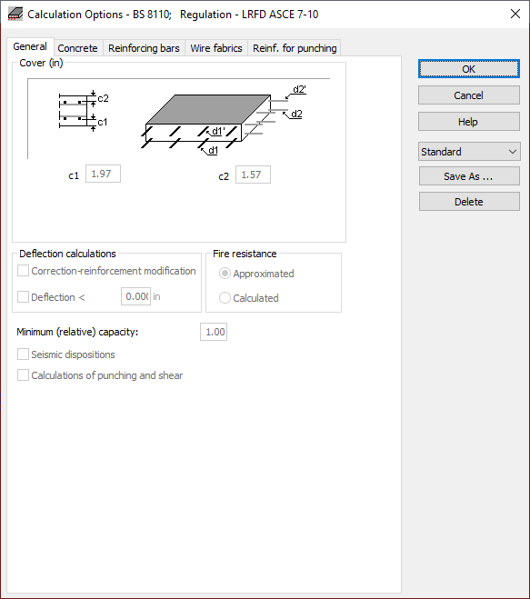 After opening the Calculation options dialog box for RC slabs and selecting the General tab, the dialog box shown below appears on screen.