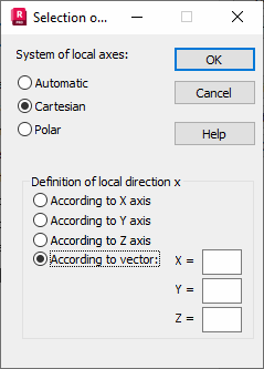 - Automatic. If selected, the local system of elements is adopted according to the system defined for each of the panels (see the description of the Local System Orientation dialog box).