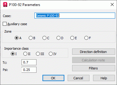 Parameters of a structure seismic analysis depend on a seismic code used during calculations of a structure influenced by seismic impact. Romanian seismic code P100-92 in the New Case Definition dialog or click Parameters in the Analysis Type dialog.
