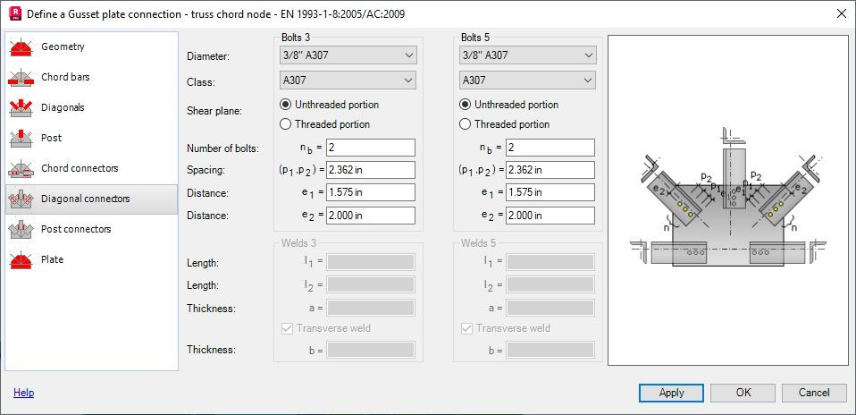 - parameters of welds used to connect the bar with the gusset plate (if a welded connection is selected for this bar).