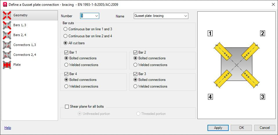 Use the Geometry tab to define basic parameters of the gusset plate. Specify:
