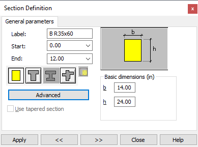 Once the Use Tapered Section option is active, a linearly varying cross section type can be assigned by entering the value of the height of the right edge of the selected segment in the h2 field. Note: for the left cantilever, h2 corresponds to the left edge of the segment.