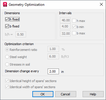 To perform an RC beam / continuous footing optimization, first a dimension that will be an optimized variable should be selected: h - height of a beam transversal section or b - width of a beam transversal section. Both dimensions may be variables simultaneously, however, defining the b/h dimension ratio is required then; this parameter will not change during optimization.