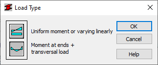During automatic calculations, the character of the load changes together with the changes of load case. For automatic calculations, the default option is Constant Moment, Linearly. After a calculation case is selected manually, or the value of internal forces is defined by the user, you can exactly determine the character of the load.