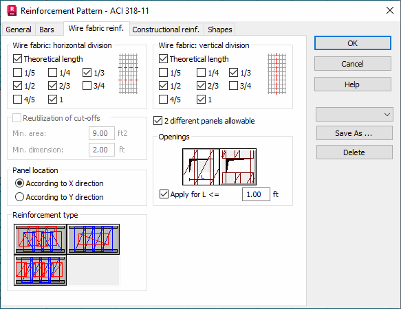 Wire fabrics do not include openings. This selects cuts that do not enter the opening contours. Take note that this is calculation intensive and will slow down the operation. Usually, it generates a greater number of smaller cuts which make final drawings less legible. It may also make slab reinforcement impossible if the division option according to theoretical (required) length is on.
