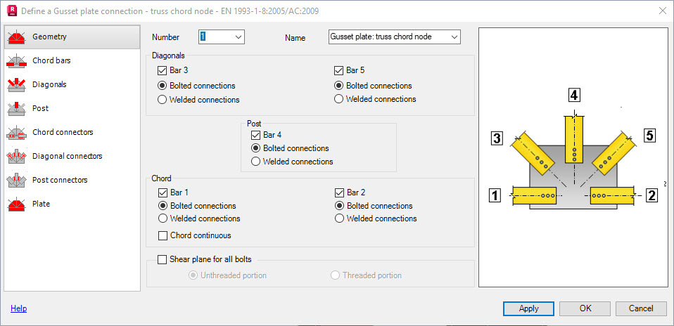 If the Chord continuous option is selected, the truss chord is made of one bar (bars 1 and 2 connect to form one bar).