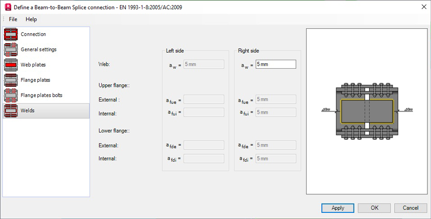 Use the Welds panel to define the thickness of the welds connecting plates with bars.