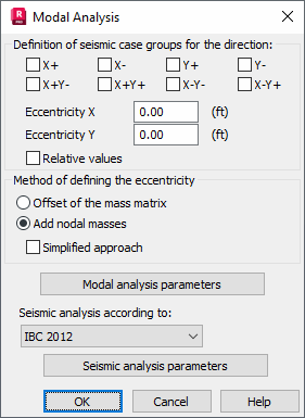 There are also two buttons for opening additional dialogs. In these, parameters of the modal analysis and selected seismic code can be specified. In the modal and seismic analysis parameters the definition of a mass eccentricity should not be set because it will automatically set during the generation of cases.