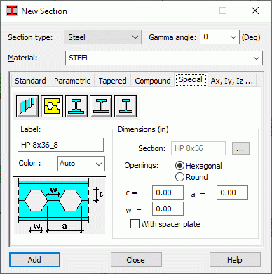 The Special tab defines special sections (sections with a corrugated web, castellated sections, welded sections: SFB, IFBA, and IFBB). The following images shows the Special tab on the New Section dialog.