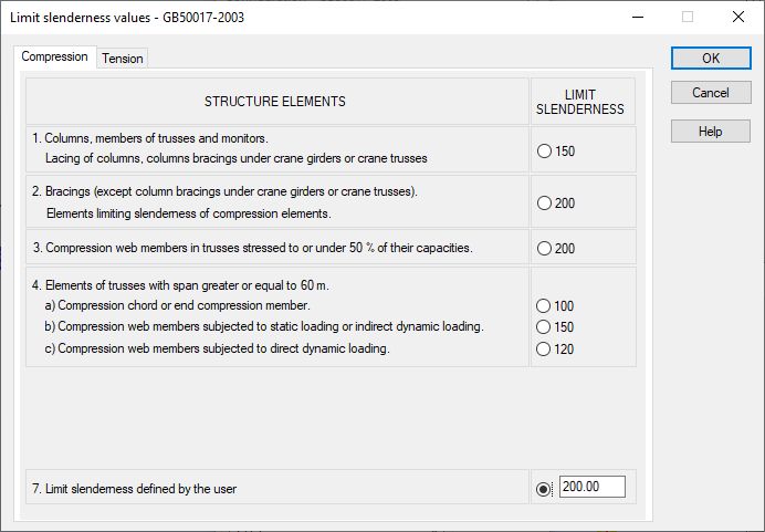 The Limit Slenderness values dialog box is used to define the limit values of slenderness for members in compression and tension. It opens on pressing the Define button in the Configuration dialog box.