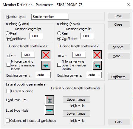 Lateral buckling calculations require that the user should specify for a member the distance between sections protected against torsion, the so called lateral buckling length. Since it is possible to fix the upper and lower flanges separately and there may be compressive stresses in the upper or lower flange for different load cases, two buckling lengths are distinguished. Therefore, the user determines a coefficient by which the base length of a member should be multiplied to obtain the lateral buckling length. The actual length of a member is assumed as the base length. The coefficient value may be entered directly or by selecting an icon representing a typical case of member fixing for which the coefficient will be chosen automatically.