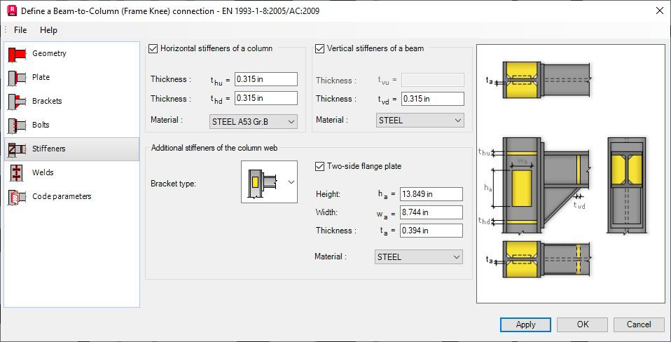 Use the Stiffeners tab to define vertical stiffeners for the beam and horizontal stiffeners for the column.