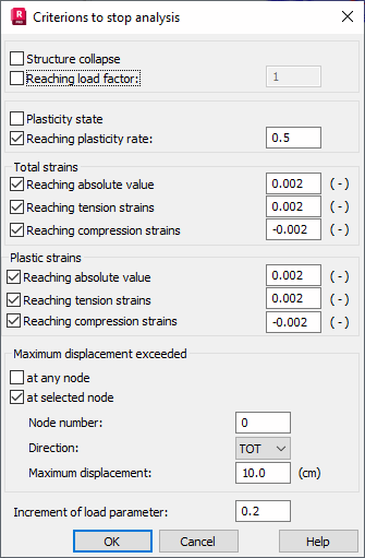 Analysis performs until the value of plastic strains (the absolute value of a strain value, the value of tension strains or compression strains) reaches a user defined value or until the divergence of the iterative process is obtained. The analysis stops if one of the conditions occurs.